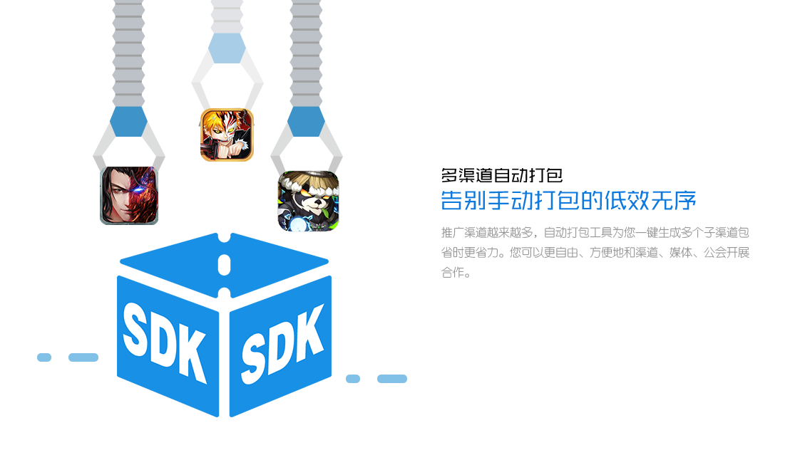 和開(kāi)發(fā)商(CP)聯(lián)運(yùn),您會(huì)獲得一個(gè)集成了您SDK的游戲母包,越來(lái)越多的推廣渠道來(lái)協(xié)助您做游戲推廣時(shí),每個(gè)推廣渠道都需要有一個(gè)獨(dú)立的子渠道包,才能統(tǒng)計(jì)每個(gè)渠道的推廣效果,給以不同的推廣分成。而人工將游戲母包集成渠道ID重新打包分成多個(gè)子渠道包是非常繁瑣、還容易出錯(cuò)的。但是,我們的打包工具就能輕而易舉,24小時(shí)無(wú)需人工,全自動(dòng)打包,不僅省時(shí)更省力。